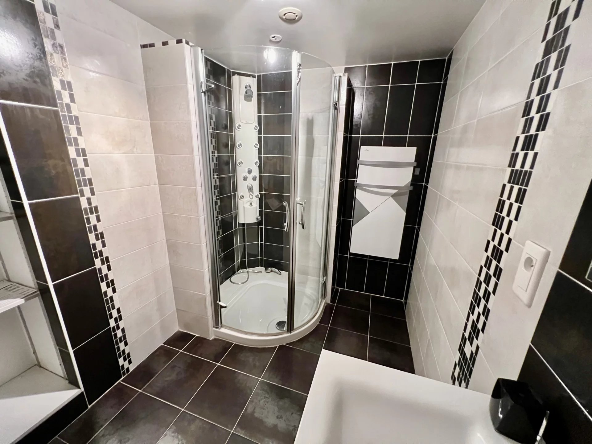 Ground floor: large living room of 48 m² opening onto terrace, independent kitchen, laundry room, bedroom with full bathroom (bathtub, shower) as well as a guest toilet.